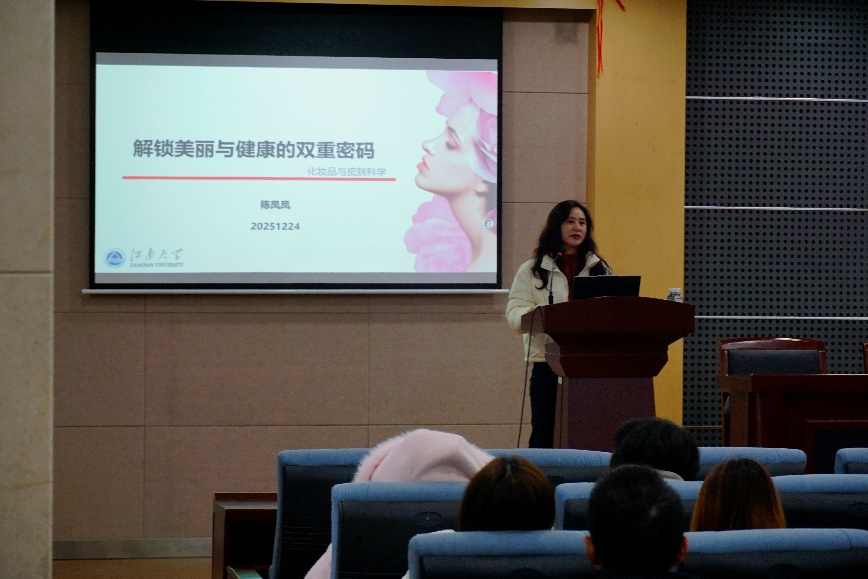 讲座伊始,陈凤凤老师明确了本次分享的核心主题—“化妆品与皮肤科学”,并通过清晰的框架梳理,向听众呈现了三大核心内容模块:中国护肤品发展历程、皮肤科学与化妆品研发、有效护肤实践。条理清晰的内容架构帮助师生快速把握分享重点,为后续深度讲解奠定了基础。