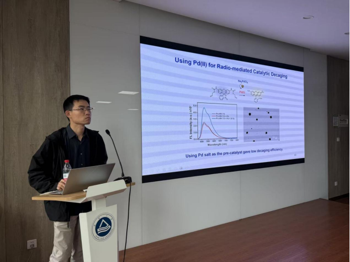 随后,北京师范大学曹玮教授作“辐射化学驱动的功能高分子设计与应用”专题报告。曹教授介绍了团队围绕辐射诊疗与辐射防护需求,在含硒黑色素材料方面开展的系列原创研究。基于硒代半胱氨酸和L-多巴氧化共聚构建的含硒黑色素材料,不仅在细胞与动物实验中表现出优异的辐射防护效果,还可通过分子工程实现X射线选择性过滤的水凝胶敷料与活体辐射调控催化,为精准放疗与生物医学材料的发展提供了全新思路。