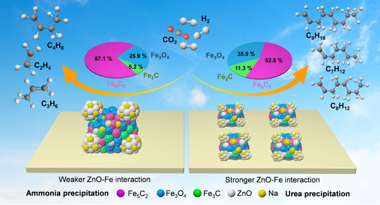 图1.ZnO-Fe相互作用对CO2费托合成反应中铁物相、粒径、元素分布,以及烯烃选择性的影响