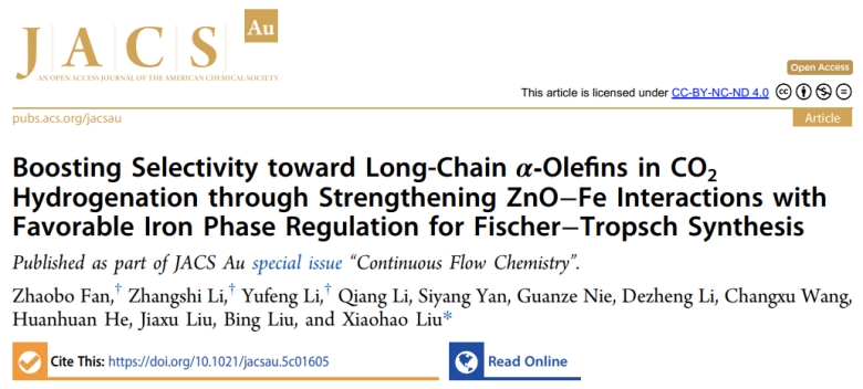 近日,江南大学刘小浩教授团队在CO2催化加氢制备长链线性α-烯烃(LAOs)的研究中取得重要研究进展,相关成果以“Boosting Selectivity toward Long-Chain α-Olefins in CO2Hydrogenation through Strengthening ZnO-Fe Interactions with Favorable Iron Phase Regulation for Fischer-Tropsch Synthesis”为题发表于国际知名期刊JACS Au。江南大学化工学院博士研究生范召博、李玉峰和硕士生李章师为文章共同第一作者,江南大学化工学院刘小浩教授为文章的通讯作者。
