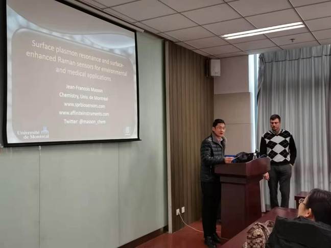 2019年12月8日,加拿大蒙特利尔大学Jean-Francois Masson教授应邀来我院进行学术交流,并在国工楼B3111进行了题为“Surface plasmon resonance and surface-enhanced Raman sensor for environmental and medical applications”的精彩报告。Jean-Francois Masson教授主要围绕多结构高性能光学基底的构建,介绍了其课题组的研究内容和最新进展,重点讲述了微尺寸SPR芯片和纳米光纤SERS基底对爆炸物、抗癌药物血药浓度,神经细胞代谢等实时监测方面取得的进展,分析了提出方法与常规技术的利弊所在,现场还展示了集合了多年研究成果的便携式多通道SPR分析仪,提出了对以上领域未来的期望。报告会吸引了许多师生前来参加,现场气氛活跃,Masson教授也与师生进行了深度的讨论与交流。