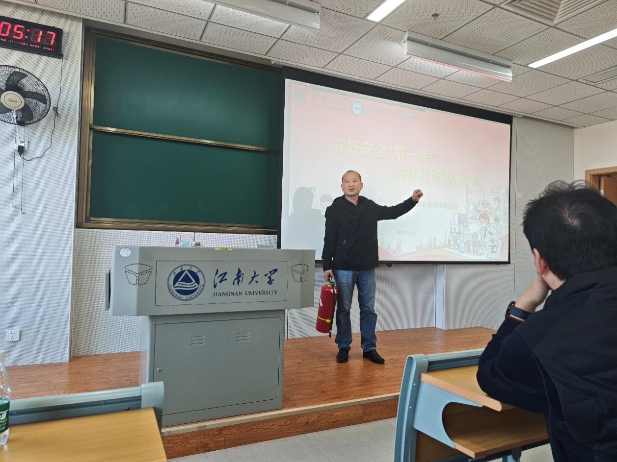 为切实强化2025级硕士研究生的安全防范意识与应急处置能力,筑牢校园安全防线,助力新生顺利开启科研与学习生活,11 月 11 日上午,江南大学化学与材料工程学院在东氿校区知行楼成功举办 “守好安全‘第一关’,共筑科研‘防火墙’”新生安全讲座暨消防模拟演练活动。宜兴市公安局反诈宣传警官高璐瑶、学校实验室与资产管理处安全技术科高珂老师、保卫处消防科刘保红老师及化工学院实验室管理张一波老师受邀担任主讲嘉宾。活动由研究生辅导员李晓洁主持。